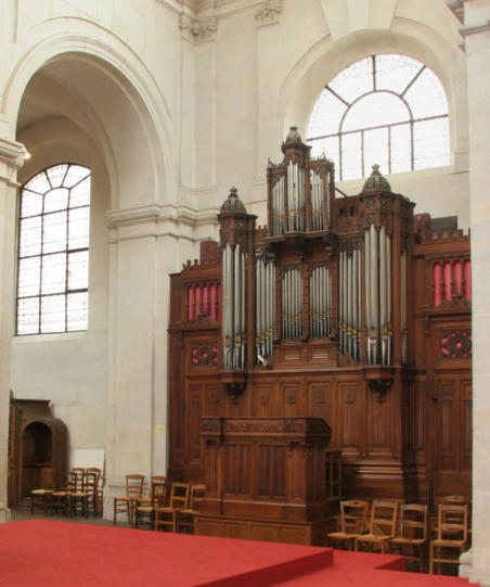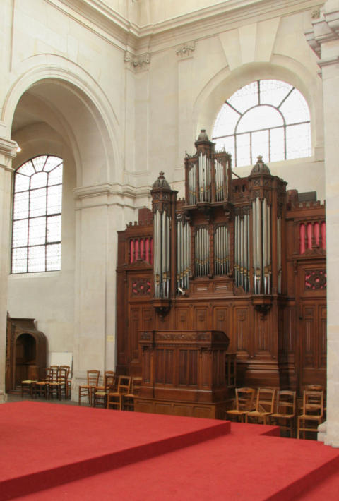 C1The choir organ was built by Aristide Cavaillé-Coll in 1865 for the salon of Baron d'Erlanger (Opus 250-229). It was offered to the city of Paris in 1927 by the son of the baron, then reassembled at the chapel of the Sorbonne by Convers-Cavaillé-Coll with the addition of a pedal extended to 30 notes and made independent by pneumatic traction. In 1987, this organ was installed in Saint-Jacques-du-Haut-Pas by Jean Renaud in place of the old choir organ (Merklin 1889, dismantled and installed in the church of Sainte-Geneviève de Rosny-sous-Bois (93) where it still stands), at the end of the south arm of the transept. The organ is still in its original state.