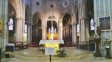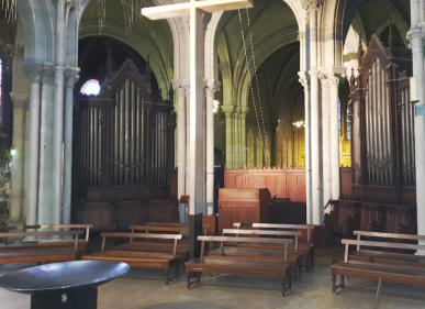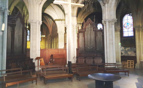 F1This organ was built by Antoine-Louis Suret in 1859. The organ is housed by two separate cases, one containing the Grand-Orgue and the other the Récit expressive. The console is placed in the axis of the church, on a platform allowing the passage of the mechanics, the organist being placed facing the altar, between the two cases. The organ has never undergone any transformation. Abandoned since the 1960s, two stops have been integrated into the composition of the grand-orgue de tribune (Bourdon8 du GO and Kéraulophone du Récit).