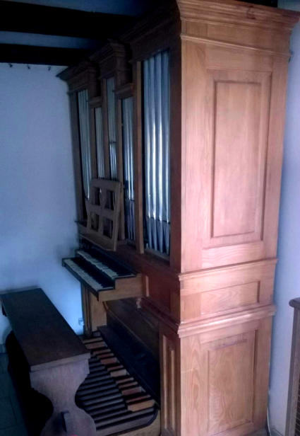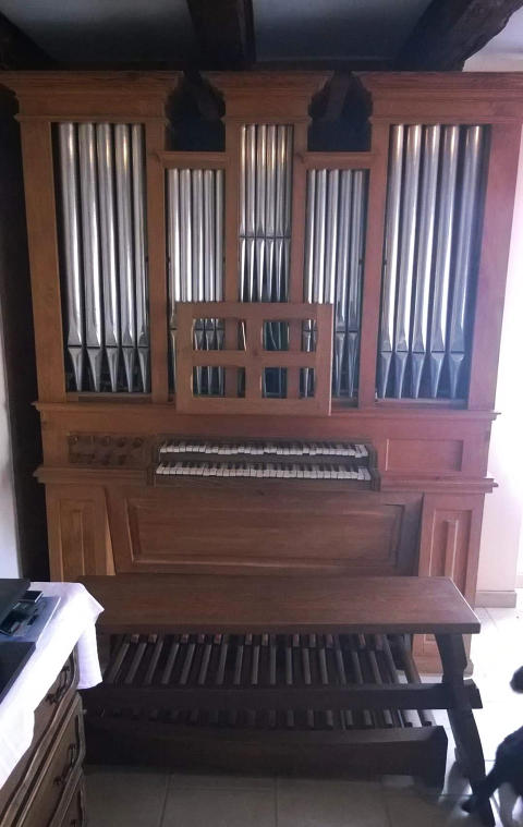 Composition1er clavier (54 notes)Bourdon 8’SPrestant 4’Nazard 2’2/3Doublette 2’Mixture III rgs2ème Clavier (54 notes)Bourdon 8’Larigot 1’1/3Pédalier (30 notes)Soubasse 16’ (prévu)Tirasse I - Tirasse II - Accouplement II/I