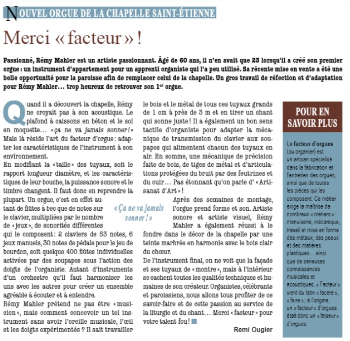 E1This is a ssmall instrument (Opus 0) built by Rémy Mahler of Pfaffenhoffen (67) in 1981. It was initially situated at a private person in Dorlisheim (67) and transferred to the crypt/the chapel Saint-Etienne of St Jean Baptiste de Grenelle in 2015.Lire plusPhotos : Victor Weller