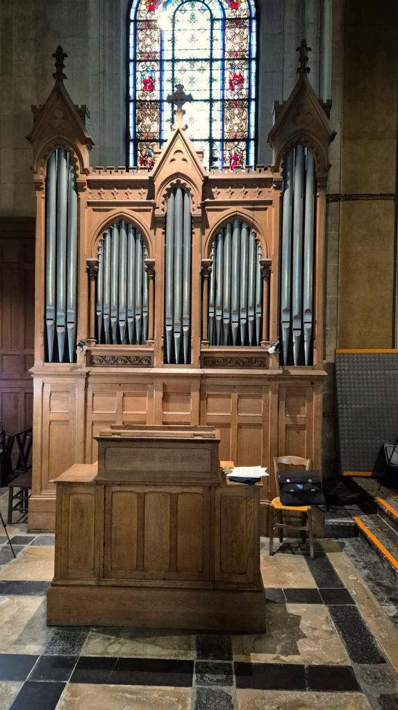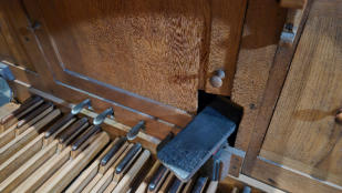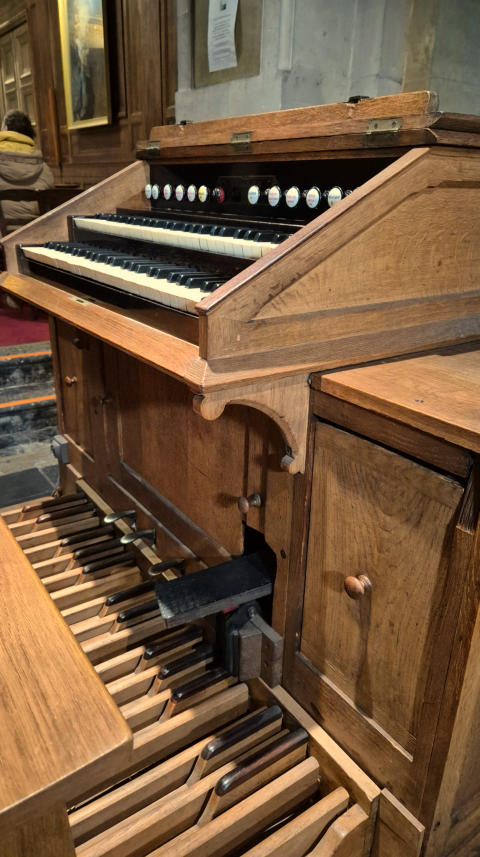C1The choir organ was built by Cavaillé-Coll in 1874, replacing an organ from 1858 built by the same builder. This instrument, from the series "number 18" of the catalog of the House Cavaillé-Coll has remained almost entirely intact to this day.In 1932, it was overhauled by Paul-Marie Kœnig. Installation of a new 30-note pedalboard with 2 drawbars of 30 notes as well. To do this, the two satellite boxes were installed around the small console of Cavaillé-Coll.Two pedal stops: Soubasse 16' and Bourdon 8' (borrowed from the 16' Bourdon). To put the register gauges, Kœnig drilled the Cavaillé-Coll cartridge! The pedalboard is offset...In 1986, restoration by Jacques Barberis (in fact his successor Jean-Pierre Swiderski): the organ was moved to its current location, to the left of the choir. Before, he was in the middle of the choir. Installation of a fan, installation and voicing of 56 pipes of the Plein-jeu in 70% pewter (which had been stolen!).Photos: Vincent Hildebrandt
