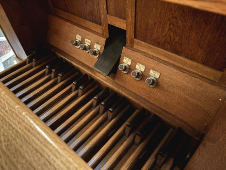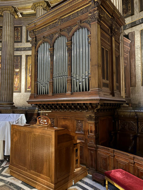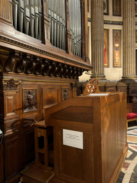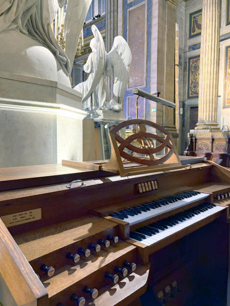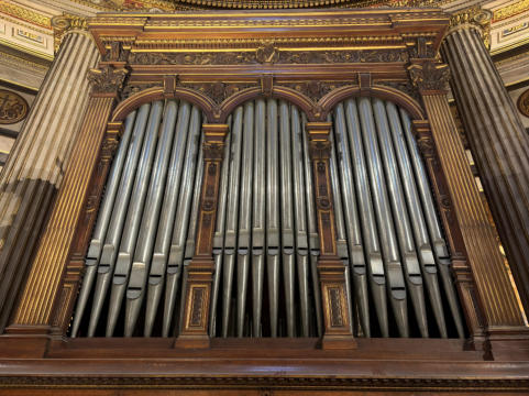 E5The choir organ was built by Arisitde Cavaillé-Coll in 1843 and originally had 12 stops spread over 2 keyboards and a pedalboard. Overhauled in 1869/80 and 19001919The organ was enlarged by Victor Gonzalez: addition of 3 stops on electric transmission, including a Plein Jeu III ranks, change of console and revoicing.1958Overhaul and extension by Boisseau.1976Restoration and transformation by Danion-Gonzalez:•New console (electric)•Electrification•Increase of the Plein Jeu from III to IV ranks, installation of a new Doublette and Sesquialtera•New electric windchests and ventilators•revoicing (J-M. Cicchero)1997Dargassies reorganized, recomposed and revoiced the organ. This is when replacing transmissions. The console went mobile.2015Dargassies added an acoustic Bourdon 32 (16 + 10 2/3) taken from the Soubasse. Pending: a Bassoon16 on the pedalboard and a Voix Humaine 8 on the Récit. The transmission has been multiplexed, which makes it very easy to move the mobile console.