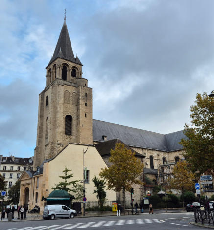 Saint-Germain-des-Prés is the oldest church in Paris, dating to the 6th century, when a Benedictine abbey was founded by Childebert, son of Clovis. During the Middle Ages, the abbey was very powerful. The Normans destroyed the abbey several times. Only the marble columns in the triforium remain from the original structure. The abbey was completely destroyed during the Revolution, but the church was spared and rebuilt in the 19th century; only one of the 3 original Romanesque belfries remained. The present building is a fine example of Romanesque architecture, in particular its tower and nave. The choir is Gothic. For a time, the abbey was a pantheon for Merovingian kings. Many of them were buried in the Chapelle de St-Symphorien, which was restored in 1981. The colorful 19th-century frescoes in the nave are by Hippolyte Flandrin, a pupil of the classical master Ingres. Romanesque paintings were discovered on the triumphal arch in the 1981 restorations. The present classicising portal was built in 1606. The choir provides an early example of flying buttresses.