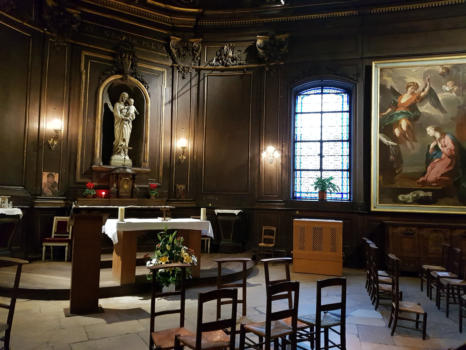 Chapelle de l’ AssomptionBuilt by the architect Jean-Baptiste Laurent (1709-1776), originally from Troyes and attached to the Prince of Condé, this chapel, first named "of the Childhood of Jesus" and then "of The Weddings", welcomed, around 1760 and until 1792, the German-speaking Catholic community. It thus became the "chapel of the Germans" and retained this name until the early years of the 20th century. From the outside, this chapel, with an amazing bulb roof, inevitably catches the attention of passers-by: they cannot miss the bronze ridge with the effigy of a pelican nourishing its young with its blood, after seeing pierced its own flesh. The interior has very interesting woodwork. The altar faces a beautiful pulpit served by two staircases.